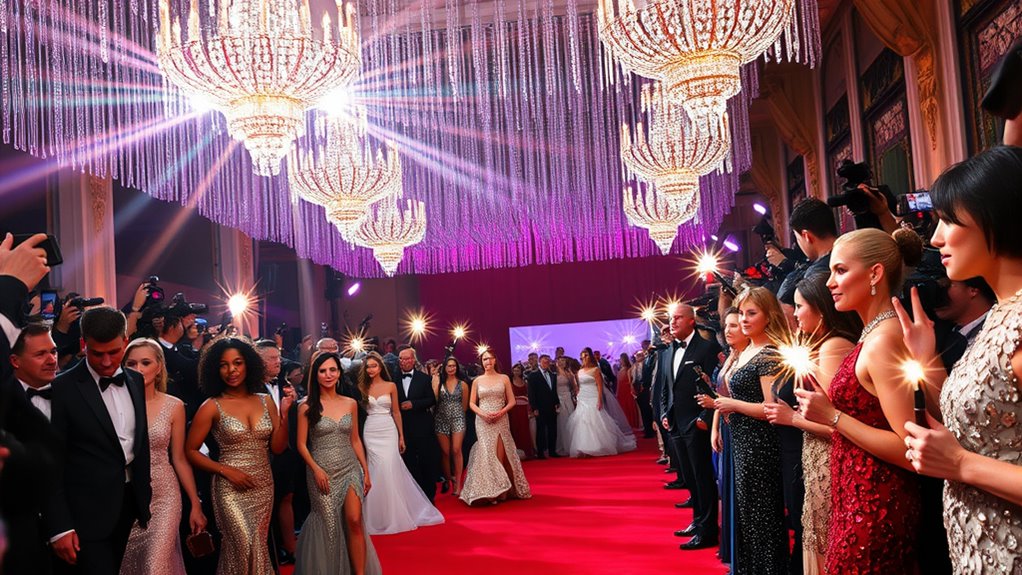 Designers collaborate with celebrities through personalized styling sessions and direct partnerships, ensuring the look aligns with their vision and the event’s theme. You can see this in celebrity styling, where designers and stylists work closely to select fabrics, cuts, and accessories. These designer partnerships often involve custom couture pieces, creating standout looks that set trends, capture attention, and reflect current fashion influences on the red carpet.