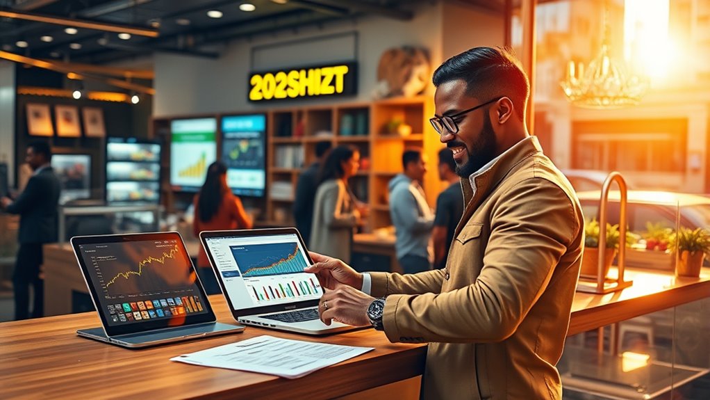 By 2025, you’ll benefit from fintech innovations that make getting credit faster and more personalized, helping your business grow quickly. Operational costs will decrease thanks to automation and smarter financial management tools, giving you more confidence to take risks. Supply chain tech and digital logistics will boost efficiency and resilience, ensuring smoother operations. Stay tuned—there’s more about how these breakthroughs can transform your small business ahead.