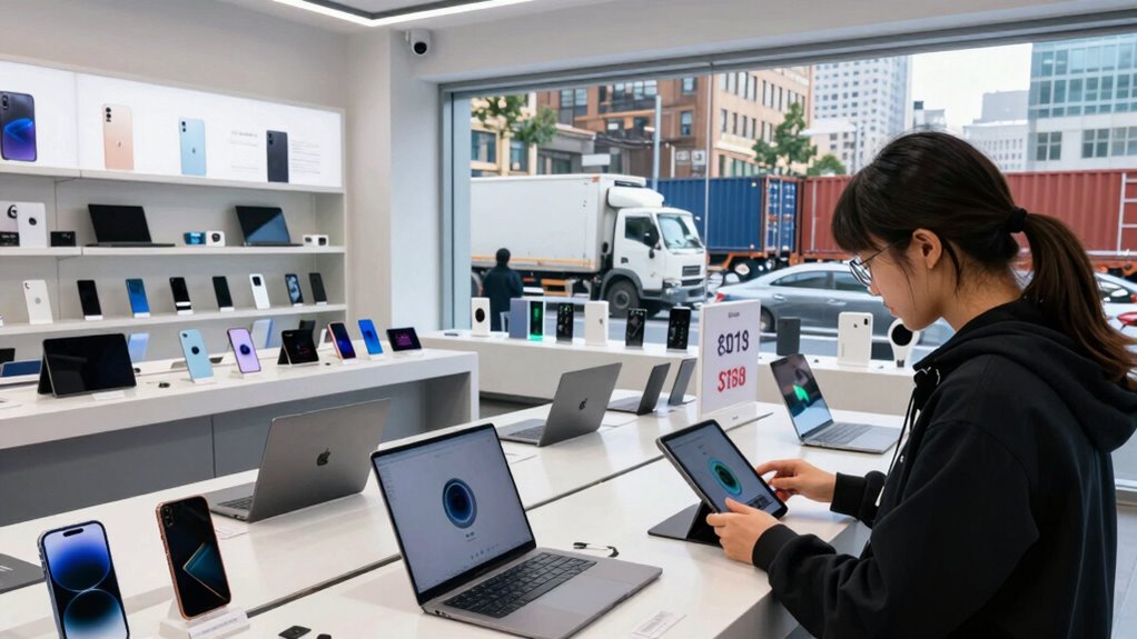 As you navigate the tech and retail markets, remember that trade tensions aren’t just headlines—they impact prices you pay. Did you know that tariffs can add up to 25% to the cost of electronics? That’s a significant jump for consumers like you. Staying informed about these tensions helps you make smarter buying decisions and prepare for potential price swings. Keep an eye on global trade news—your wallet will thank you.