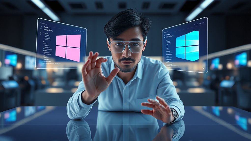 With Apple’s VisionOS 2, you can run Windows in mid-air, creating an immersive mixed reality workspace. It uses advanced holographic interfaces that respond to gestures and voice commands, making interaction intuitive and seamless. To do this, you’ll need compatible hardware, proper setup, and virtualization tools. This integration opens up new possibilities for multitasking, productivity, and app development. Explore more to discover how this innovative feature transforms digital interaction in physical space.