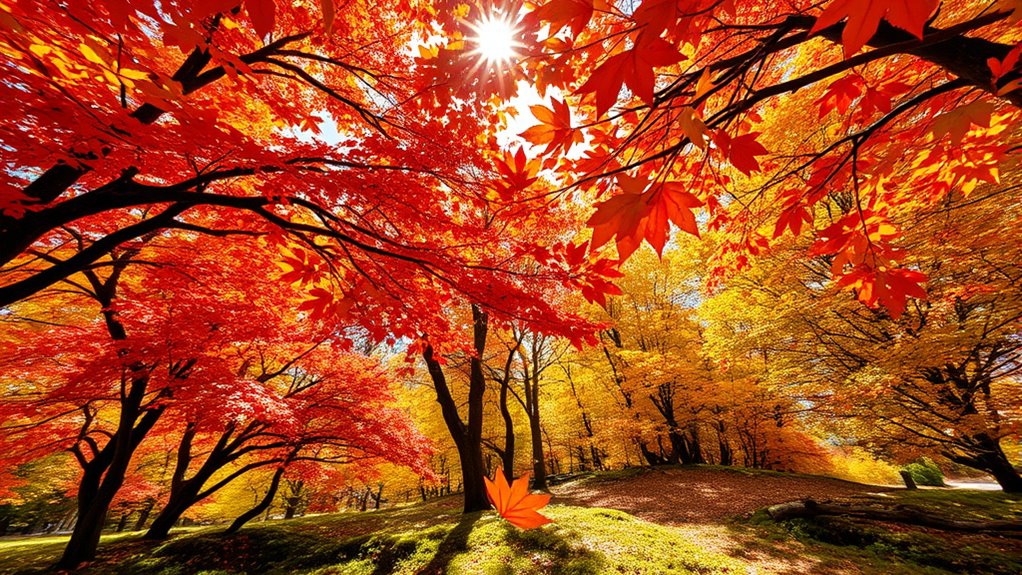 As autumn arrives, you see leaves turn vibrant reds, oranges, and yellows because of changes in tree biology. When days get shorter and temperatures drop, trees produce less chlorophyll, which makes leaves green. This reveals other pigments like carotenoids and anthocyanins, giving the leaves their stunning colors. Different tree species create a variety of hues, making fall scenery breathtaking. If you want to understand the science behind these colors, keep exploring how trees adapt to seasonal changes.